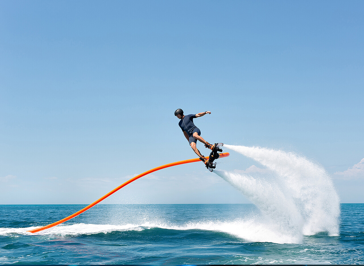 Durch Wasserdruck ist dies beim Flyboarding möglich. Die Passagierin bzw. der Passagier befestigt das Board an den Füßen und mithilfe eines Schlauches wird Wasser mit einer Jetskipumpe in zwei Düsen befördert. Mit dem daraus entstehenden Wasserstrahl „fliegt“ die Sportlerin oder der Sportler wie eine Superheldin oder ein Superheld durch die Luft.