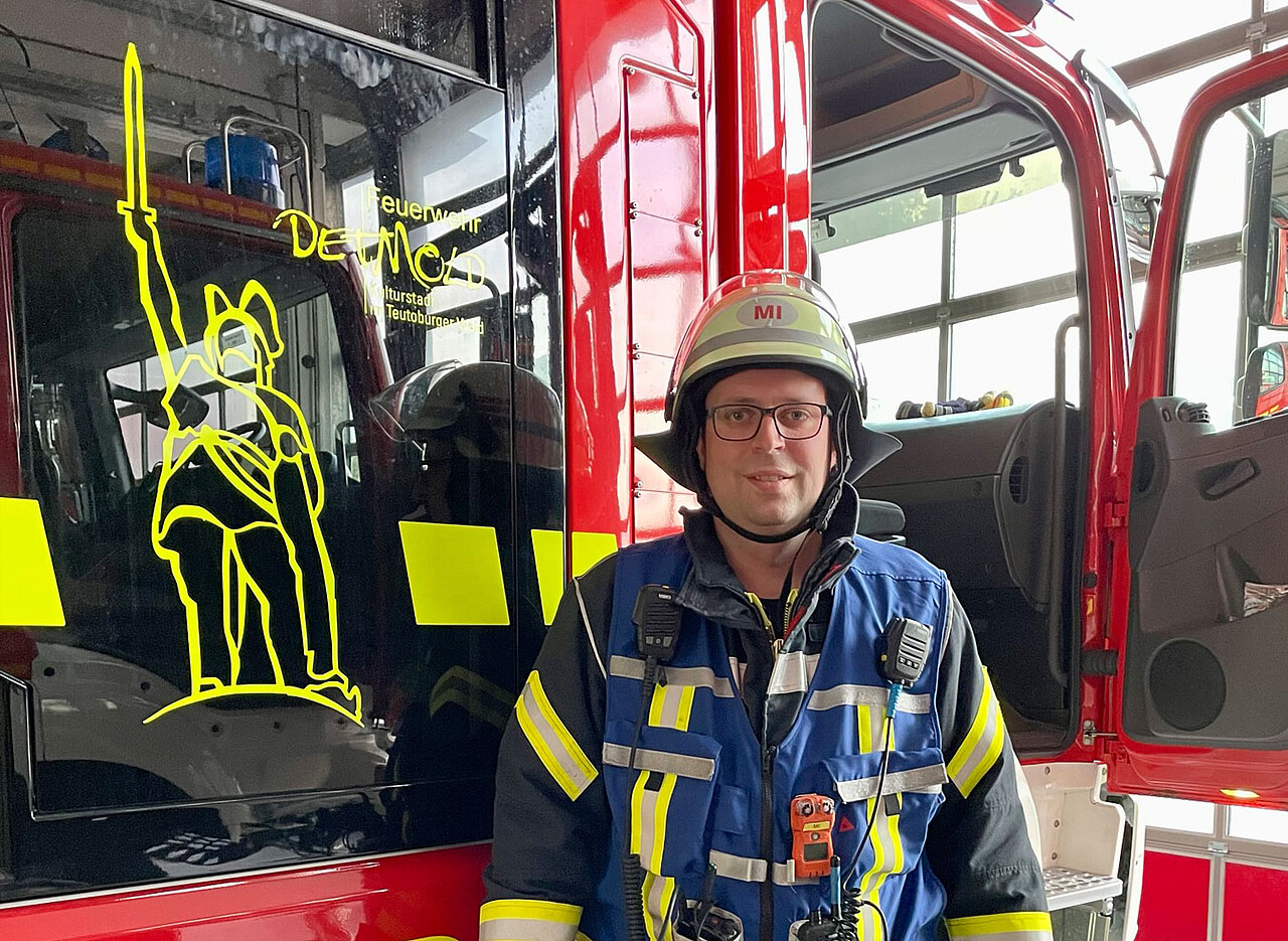 Die Feuerwehr Detmold ist eine Freiwillige Feuerwehr mit hauptamtlichen Personal. Das bedeutet, bei größeren Lagen arbeiten die Berufsfeuerwehrleute und die Ehrenamtlichen Hand in Hand. „Wenn zum Beispiel nur ein Papierkorb am Bahnhof brennt, dann fahren die Hauptamtlichen alleine zum Einsatzort. Lautet die Meldung allerdings Küchenbrand, dann rücken zwei Einheiten aus – und somit auch Ehrenamtliche“, sagt Stefan Kall. Unsere Unternehmensgruppe stellt den IT-Administrator für seine ehrenamtliche Tätigkeit bei der Feuerwehr frei, wenn es die betrieblichen Abläufe zulassen. Das gilt nicht nur für die rund 100 bis 120 Einsätze, zu denen er im Jahr gerufen wird, sondern auch für die Aus- und Weiterbildung.