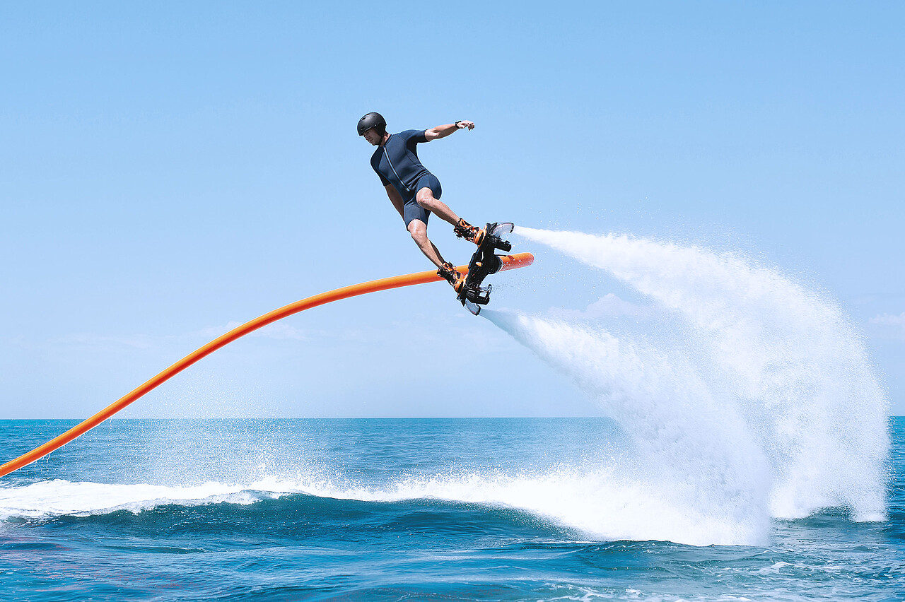 Sie möchten bis zu neun Meter in die Luft abheben? Durch Wasserdruck ist dies beim Flyboarding möglich. Die Passagierin bzw. der Passagier befestigt das Board an den Füßen und mithilfe eines Schlauches wird Wasser mit einer Jetskipumpe in zwei Düsen befördert. Mit dem daraus entstehenden Wasserstrahl „fliegt“ die Sportlerin oder der Sportler wie eine Superheldin oder ein Superheld durch die Luft.